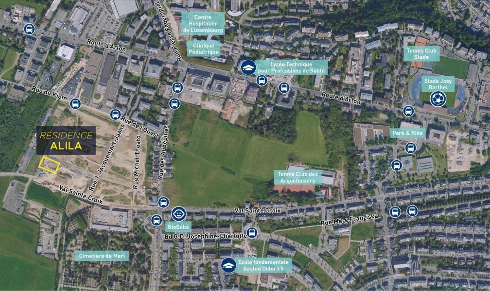 Mobilité A proximité directe de la résidence, sur la rue du Kiem, se trouve l’arrêt de bus «Belair, Rue de l’Ouest» qui est fréquenté par la ligne 8 en direction de la Place de l’étoile, Hamilius ainsi que les lycées du Limpertsberg et de l’autre côté vers Strassen et Bertrange. En tournant dans la rue des Aubépines, on trouve un arrêt de bus desservi par les lignes 13 et 24 en direction du Bouillon, Hollerich et Howald resp. de la maternité et du Centre Hospitalier.